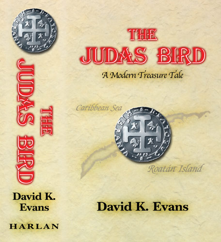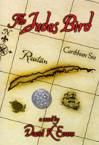 The Judas Bird was the first novel by Wake Forest professor David Evans. At first it looks like I'm being "typecast" as a designer for covers of pirate novels, but this book does not feature piracy as such a strong element of the story as Vow of Vengeance did. Instead, the island of Roatán itself, off the coast of Honduras, is the major player in the story, which was why he wanted an old-fashioned map on parchment paper as the cover.
